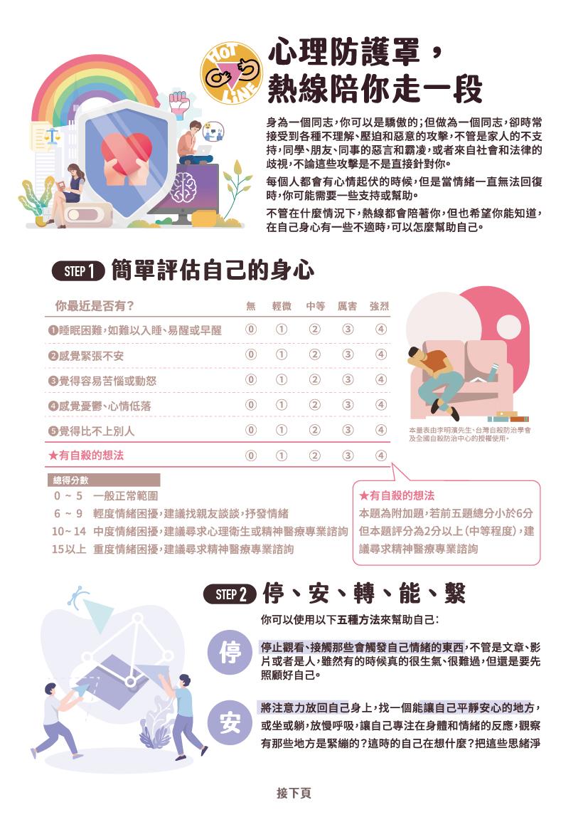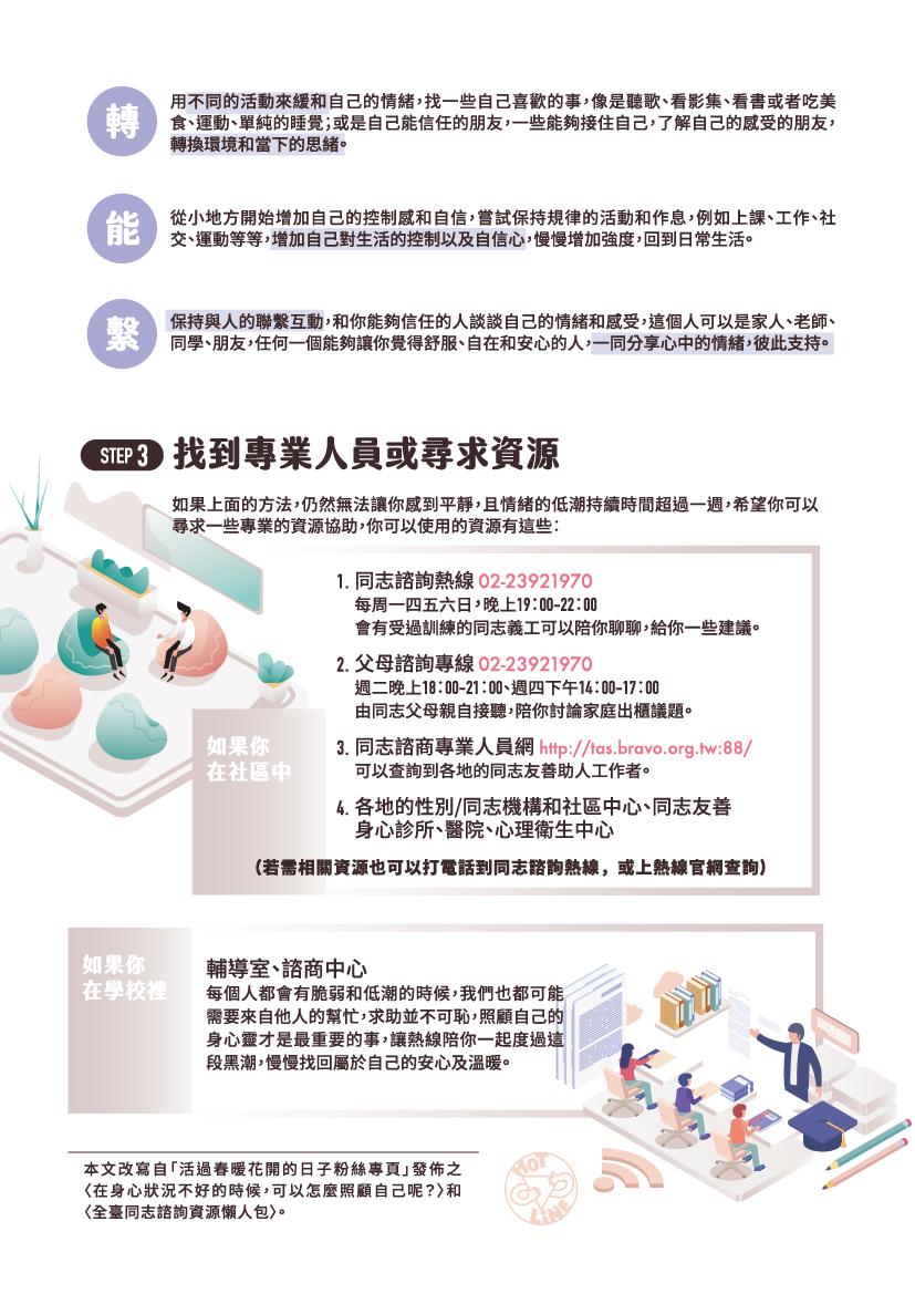 不管在什麼情況下,同志諮詢熱線都會陪著你,但也希望你能知道,在自己身心有一些不適時,可以怎麼幫助自己。